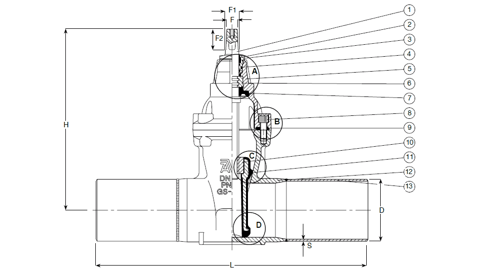 Клиновая задвижка с упругим запиранием с длинными стальными сварными концами по DIN 2470, ч.2,