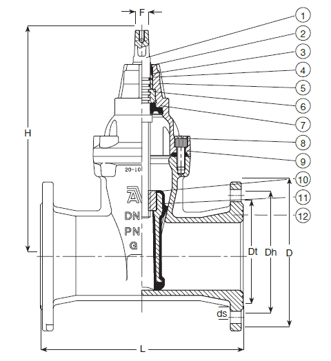 | Клиновый затвор | Ковкий чугун, с сердечником полностью вулканизированным резиной EPDM, где интегральная гайка клина – из устойчивой к обесцинкиванию латуни CZ 132 по BS 2874 |