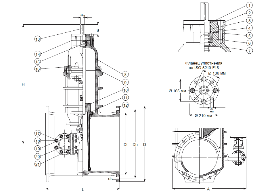 DN | L, мм | H, мм | Dt, мм | D, мм | Dh, мм | Ds, мм | Кол-во отверстий | ød, мм | A, мм | g, мм | Вес, кг | ||||
