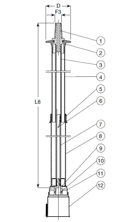 | 2. Верхний переходник с ушами | 8. Нижняя наружная труба |