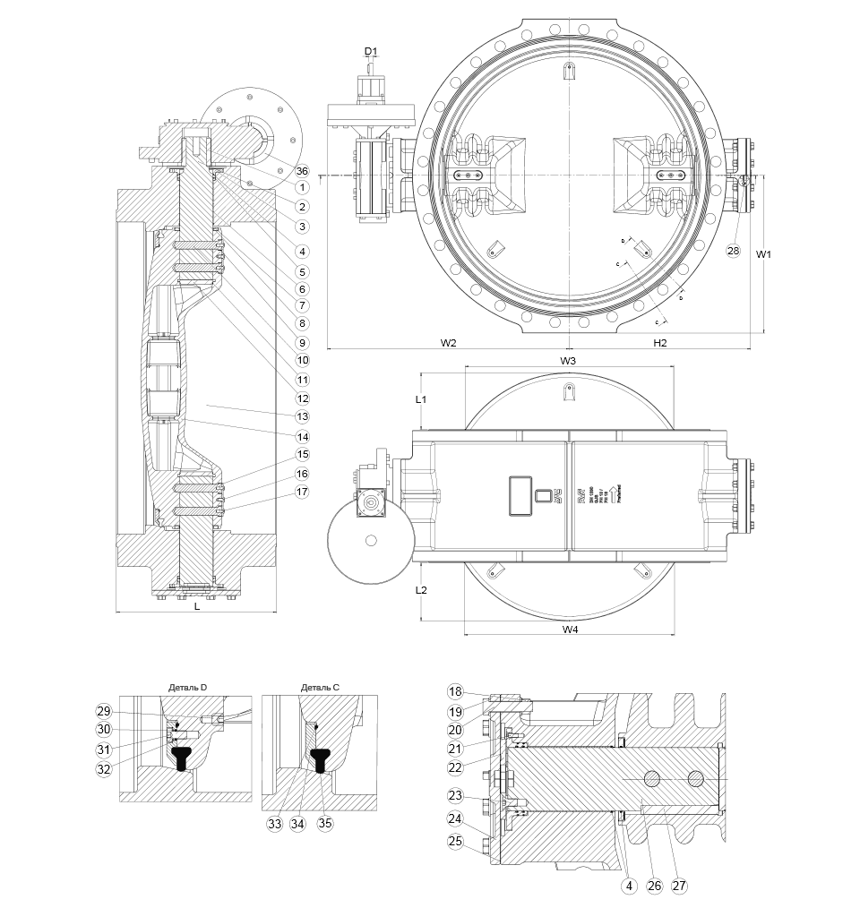 | Артикул | DN, мм | L, мм | L1, мм | L2, мм | H2, мм | W1, мм | W2, мм | W3, мм | W4, мм | D1, мм | Фланец ISO | Вес, кг |